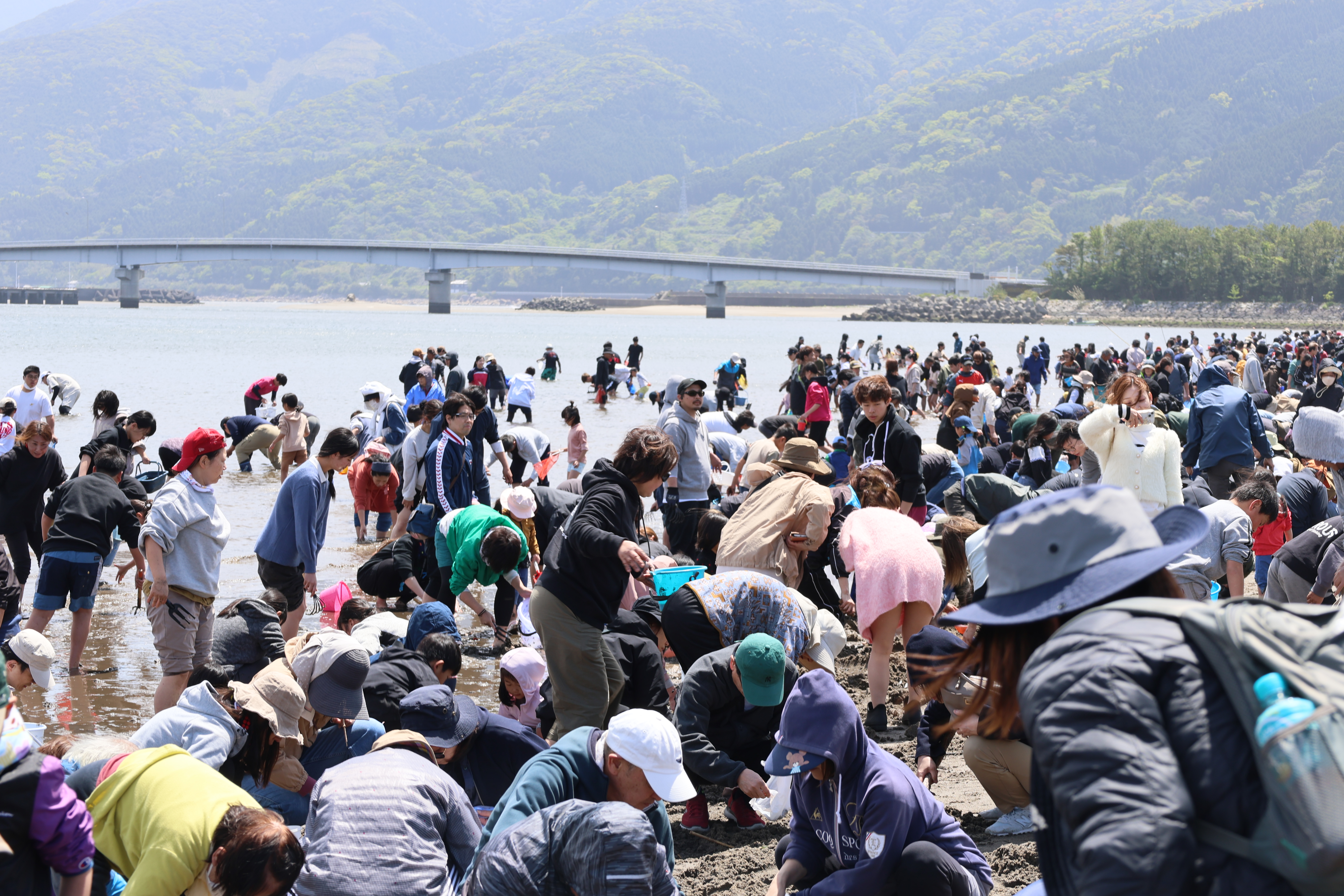 毎年春に開催される「ルーピン祭り&潮干狩り」は、町花であるルーピンの見頃に合わせて行われ、家族連れに人気のイベントです。会場となる柏原海岸では、全長約1kmにも及ぶ黄色いルーピンの花畑が海沿いに広がり、その美しさは訪れる人々の目を楽しませてくれます。祭りの目玉のひとつである潮干狩りは、正午ごろからスタート(潮の満ち引きによります)。事前に放流されたアサリを無料で採ることができ、自然とふれあいながらのんびりと過ごせる春の風物詩です。