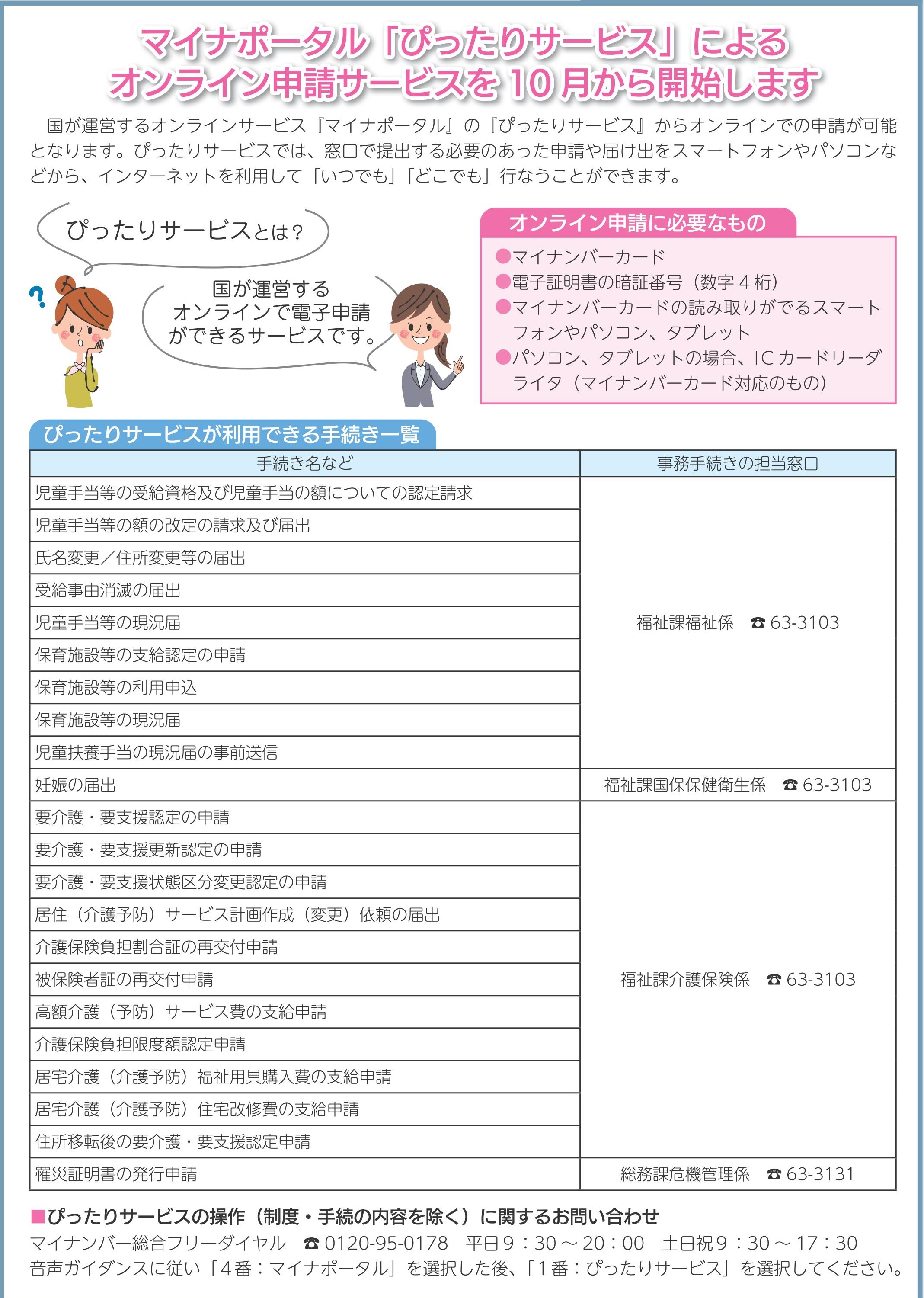 マイナポータル「ぴったりサービス」によるオンライン申請サービスを10月から開始します。