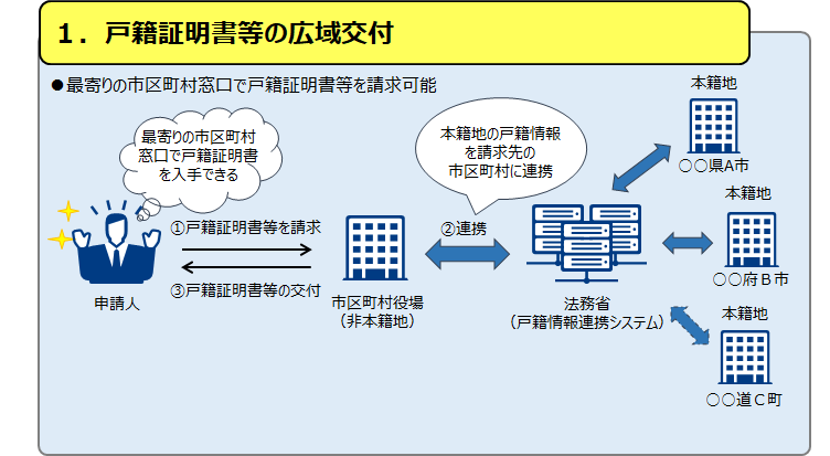 令和6年3月1日から、戸籍法の一部改正により、本籍地以外にお住まいの方でも、戸籍証明書等を最寄りの市区町村の窓口で取得できるようになりました。