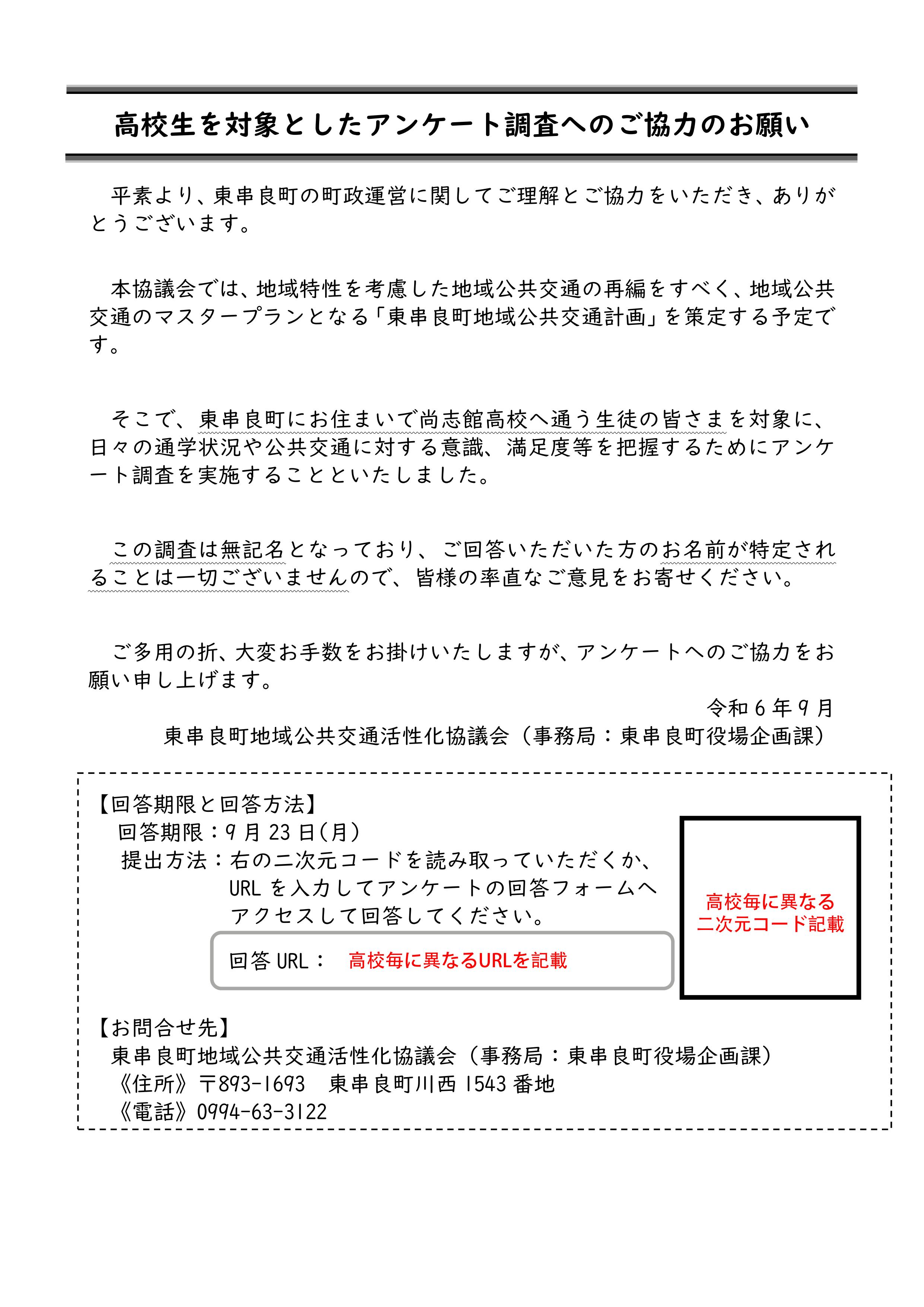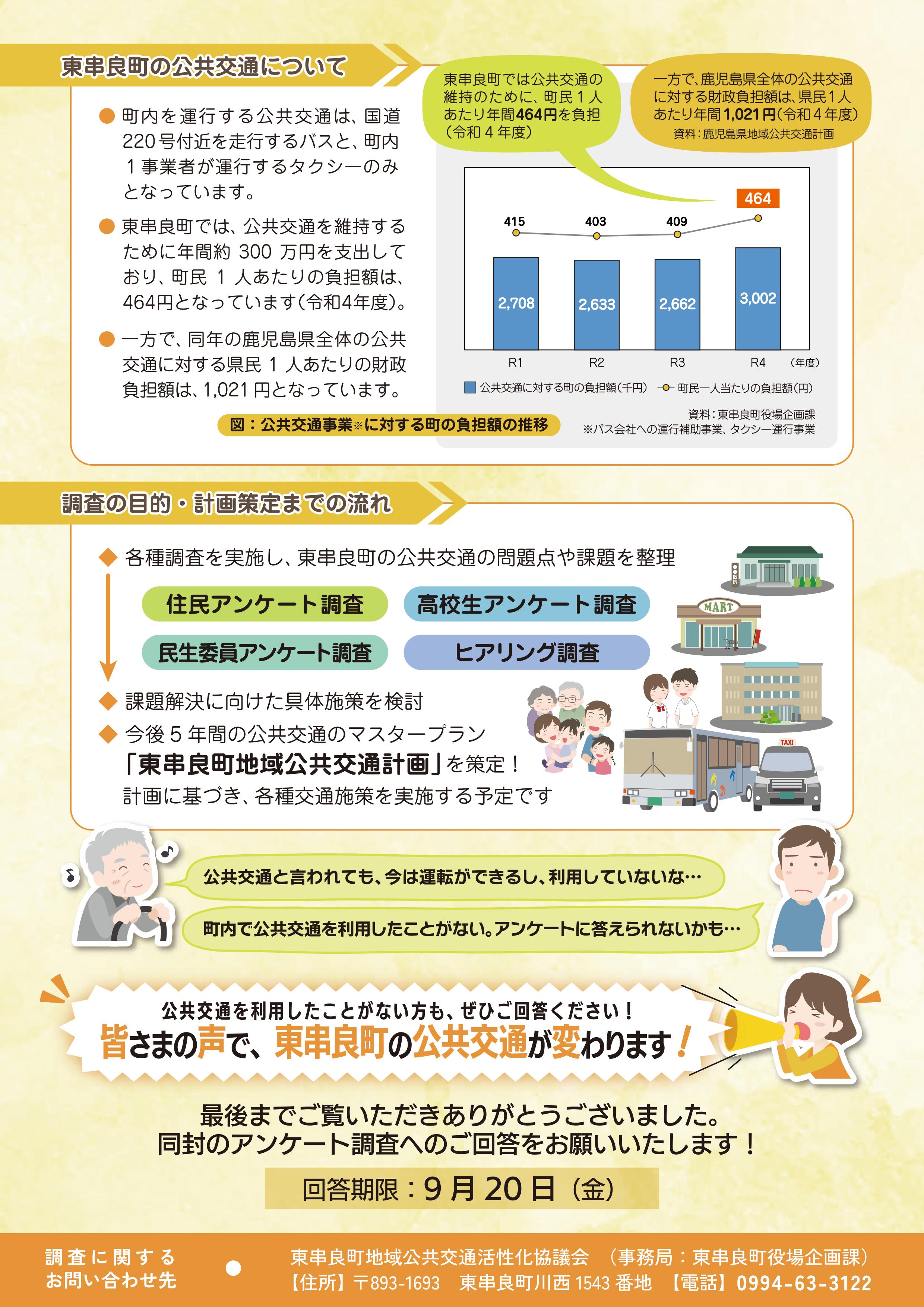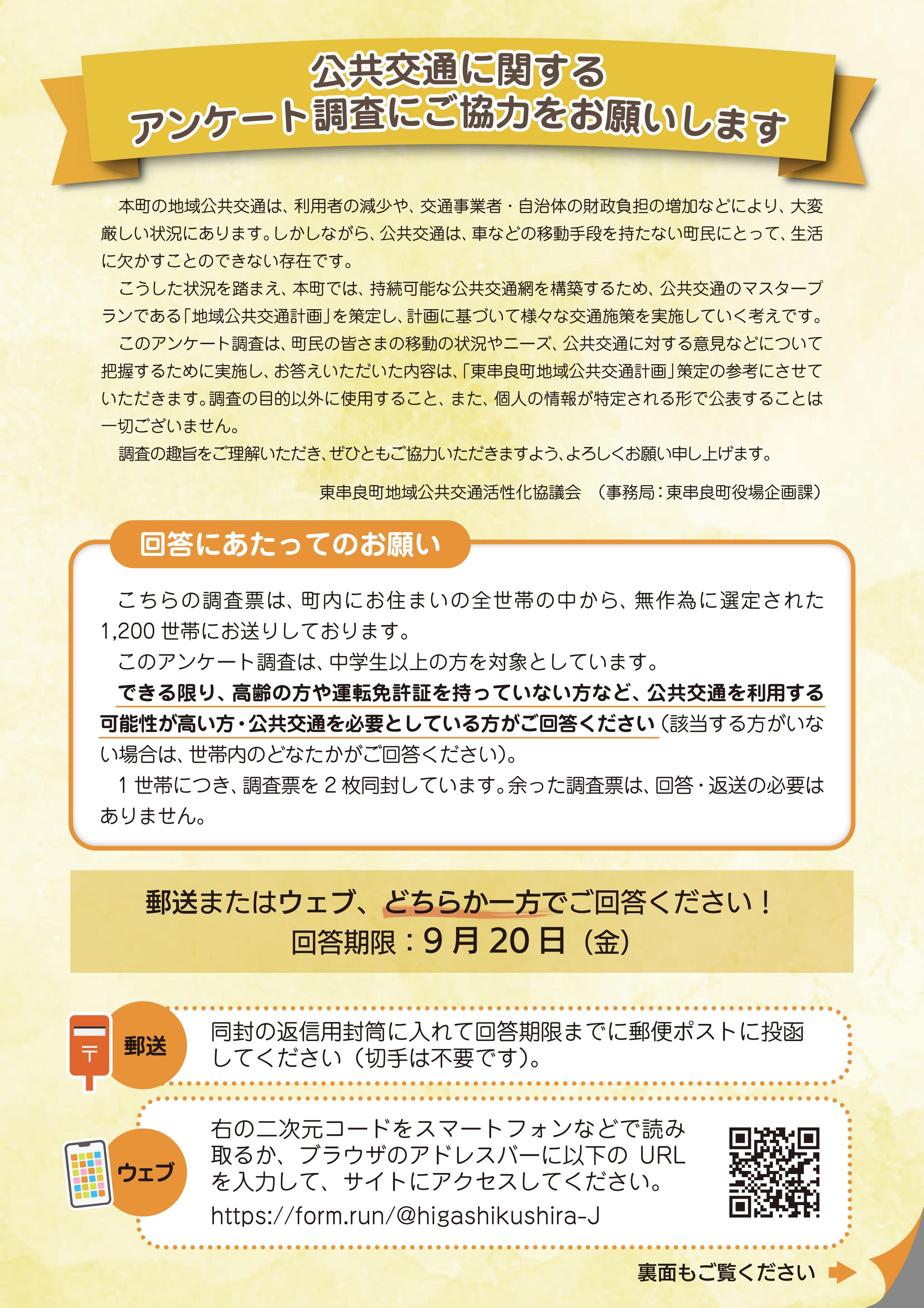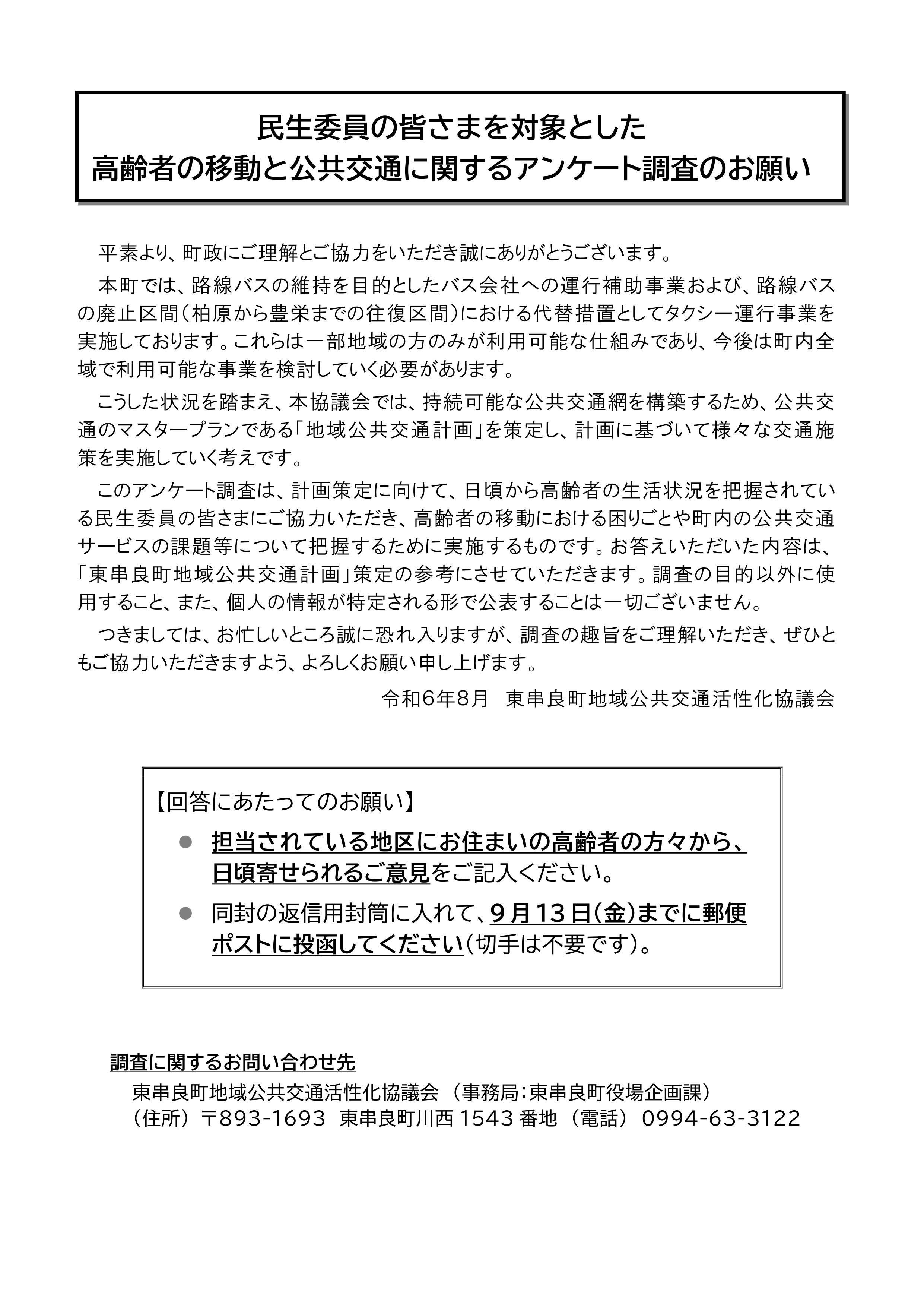 本町公共交通のマスタープランとなる「東串良町地域公共交通計画」策定に向けて、住民の皆様の移動実態や公共交通に対するニーズ等の把握を目的として、下記のとおり住民アンケート等を実施しております。皆様の声で、東串良町の公共交通が変わります。ご協力をお願いします。